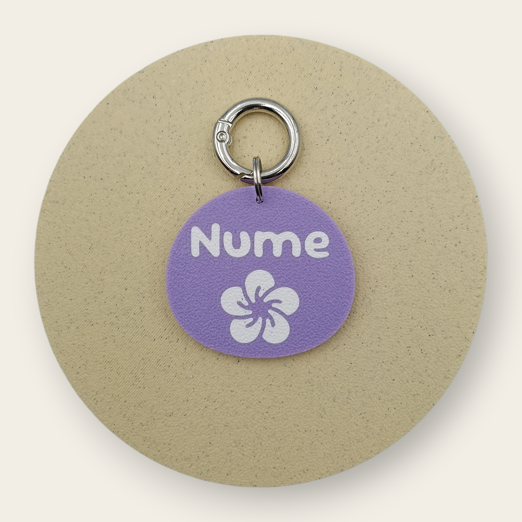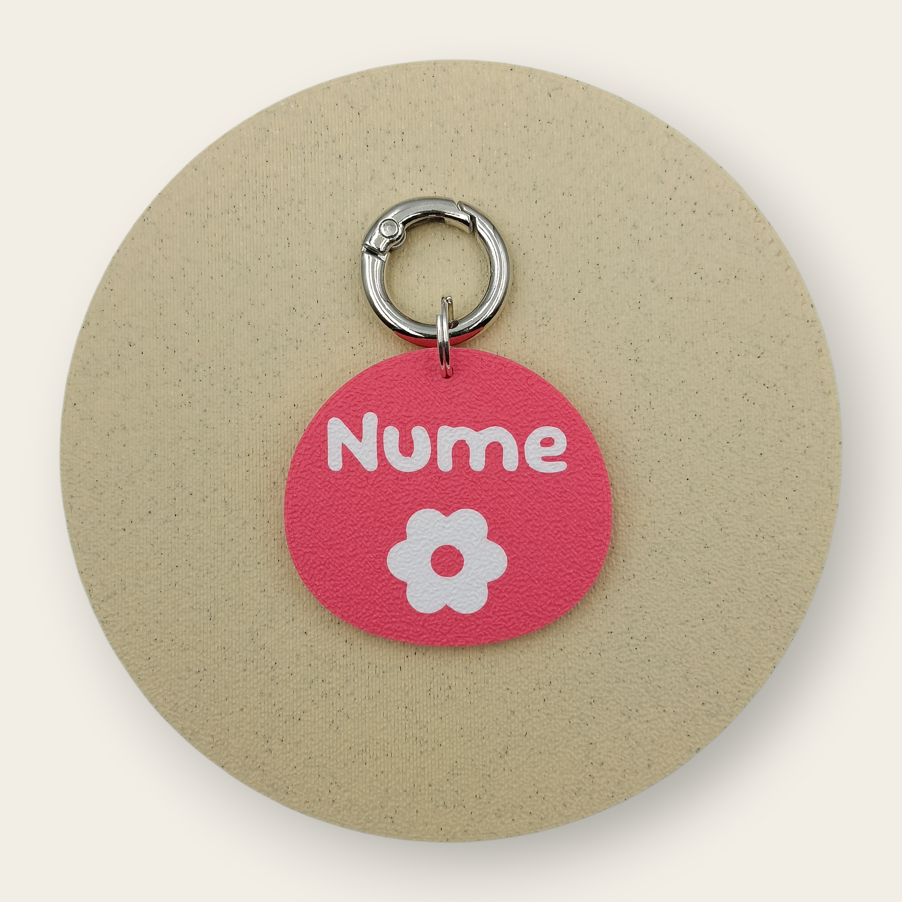 Nume pe față, telefon opțional pe spate. Text integrat în material, carabină cu arc inclusă.