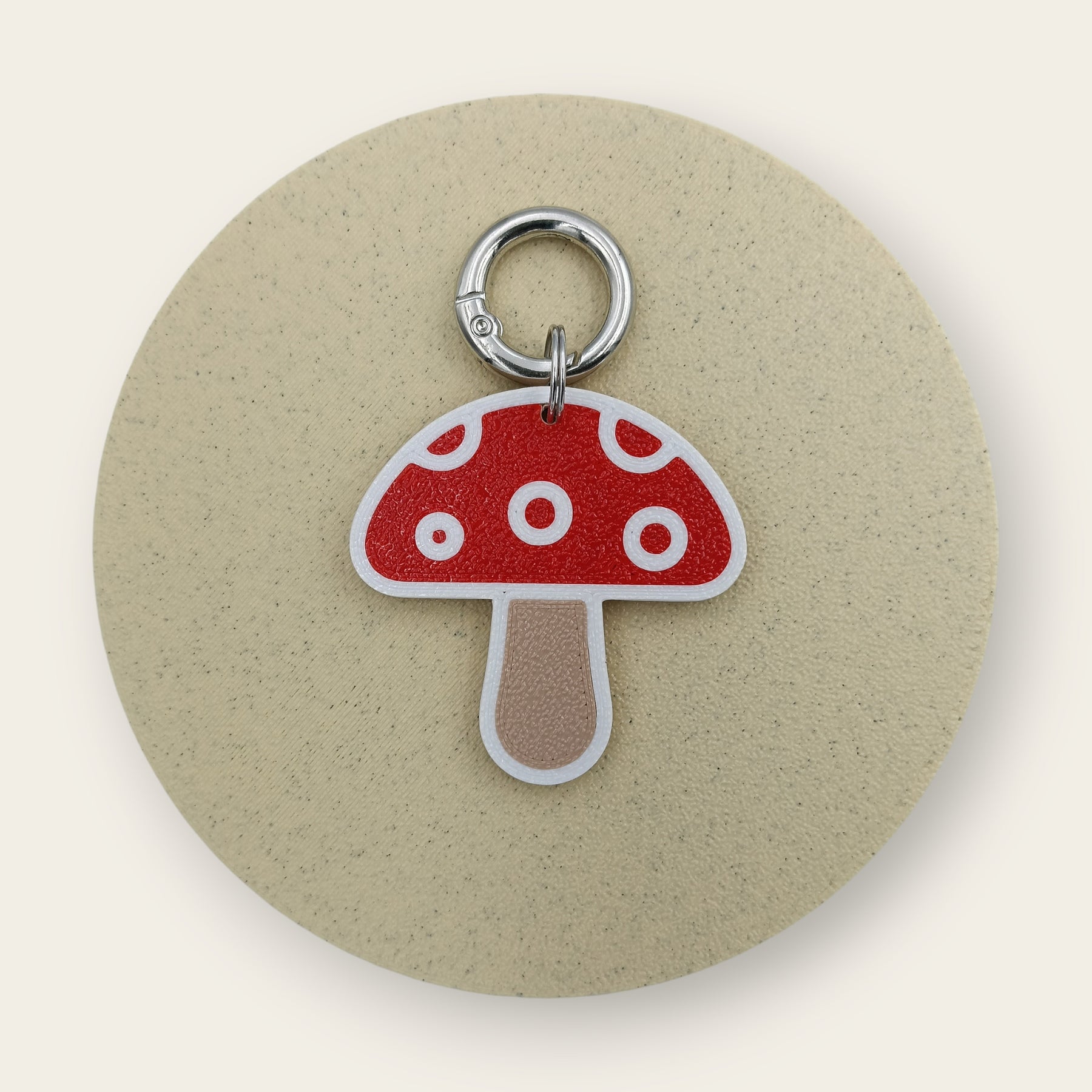 Ciupercă stilizată bej cu pălărie roșie și puncte albe — mutată pe zgardă.